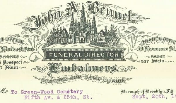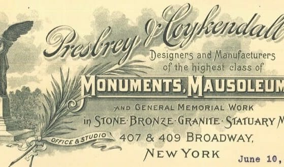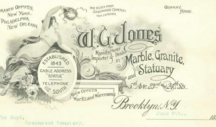 Green-Wood has millions of documents in its archives—a wide variety of records produced during the day-to-day business of the Cemetery and recording the over 570,000 internments across the grounds. Since 2010, volunteers have been working to archivally preserve the most robust record group: Green-Wood’s burial orders. In the process, they’ve come across hundreds of beautiful and fascinating nineteenth-century letterheads—those of businesses owned by lot owners communicating instructions or requests to the Cemetery, or of businesses engaged with the Cemetery, such as monument makers, florists, and funeral directors. Here are just a few of the most interesting.