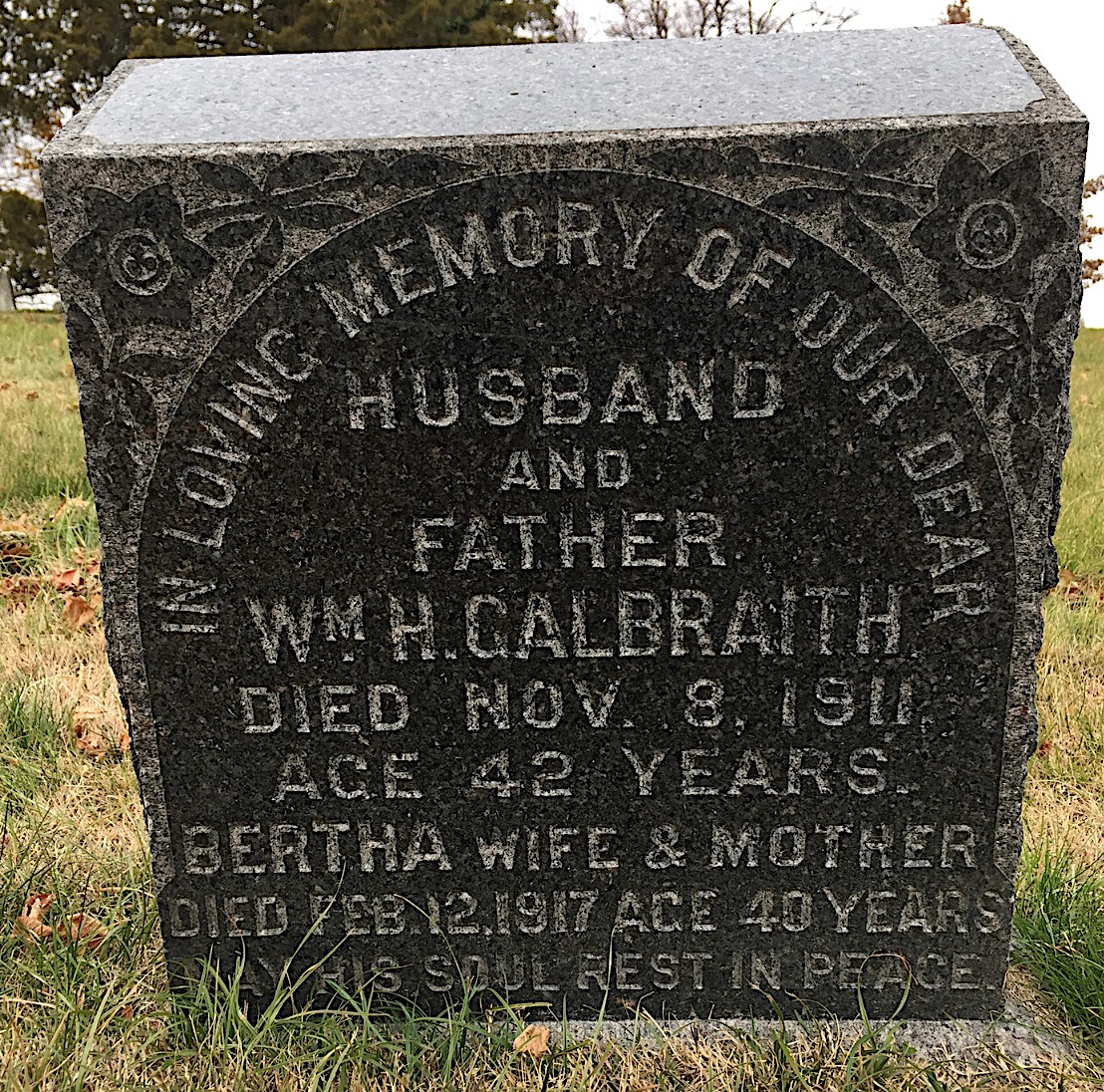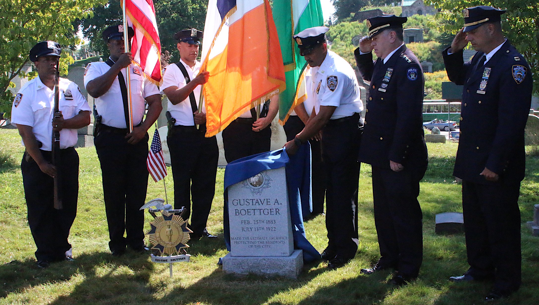 In 2017, two police officer who are interred at Green-Wood and died a century ago from injuries sustained in the line of duty were honored by the NYPD. Police Officer William Galbraith (1869-1911) (section 122, lot 17806, grave 347) was on mounted patrol in the Bronx in 1911 when he was thrown from his horse, suffering a skull fracture and a cerebral hemorrhage; he died six days later at Fordham Hospital at the age of 42, leaving behind a wife and two young children.