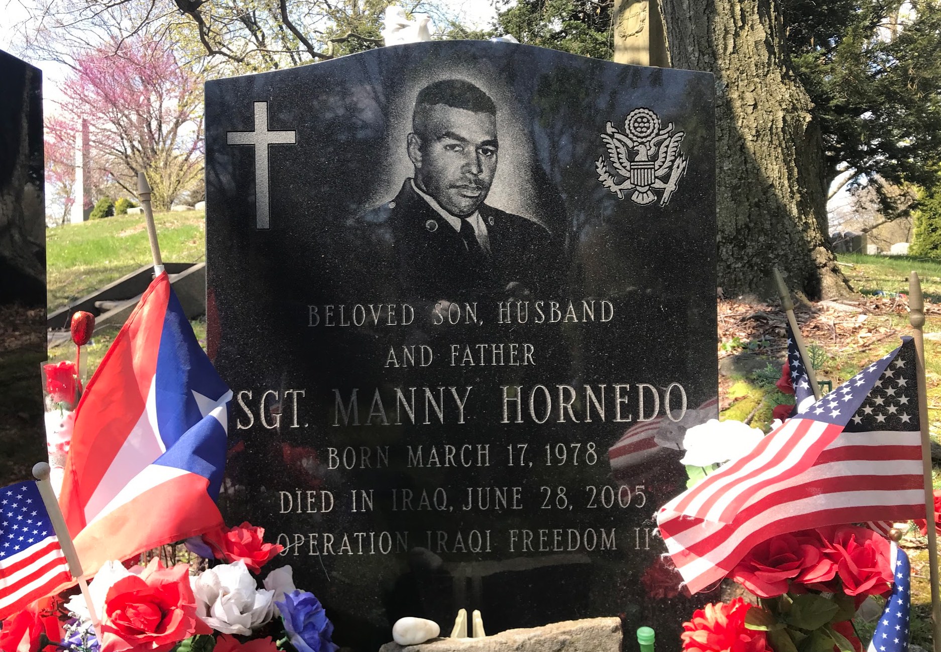 Family, uniformed comrades, and a color guard gathered at the grave of Manny Hornedo of Sunset Park on July 2 to remember him. Hornedo enlisted in the National Guard soon after 9/11 in 2001. He was working at The Gap store in Herald Square in January, 2005, and had passed the test to become a court officer, when his unit, the 1569th Transportation Company, was activated and sent to Iraq. In June of 2005 he was manning a machine gun, protecting a convoy near Tikrit, when a truck explosion killed him. He is survived by his wife and high school sweetheart, Melissa, and two young children, Manny, Jr., and Marcus.