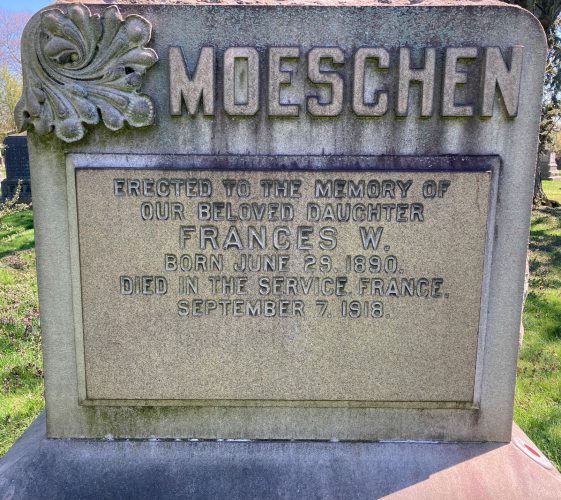 Laura O. McGrath (1889-1918) (section 147, lot 22297) was a graduate nurse at the Methodist Episcopal Hospital in Brooklyn when she was assigned, as a member of the Army Reserve Nurse Corps, to Camp Grant in Winnebago, Illinois, where the 86th Division was training for service in World War I. While fighting the influenza pandemic that was sweeping the camp and the country, she likely caught it herself and died there of pneumonia. A Red Cross nurse serving in France, Frances Moeschen (1893–1918) (section 138, lot 24881) also died of pneumonia as the 1918 Pandemic swept through France. She was just twenty-eight years old.
