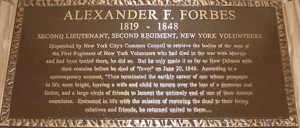 Sadly, after retrieving the bodies of the fallen, he made it alive only as far as New Orleans with their remains. It was then the peak of the malaria season. In a letter dated June 22, 1848, Lieutenant Robert Floyd wrote to Forbes’s brother, reporting that he had arrived in New Orleans and heard that Alexander was there also. He went to meet him and found Alexander ill with what Alexander described as seasickness. Concerned, and believing that it might be a fever, he summoned two doctors who diagnosed the problem as “black vomit.” Alexander rallied and the doctors believed he would recover, but he died of “fever” on June 20, 1848. Lieutenant Floyd then took over the task and brought the bodies, including Forbes’s in a lead coffin, home to New York City.