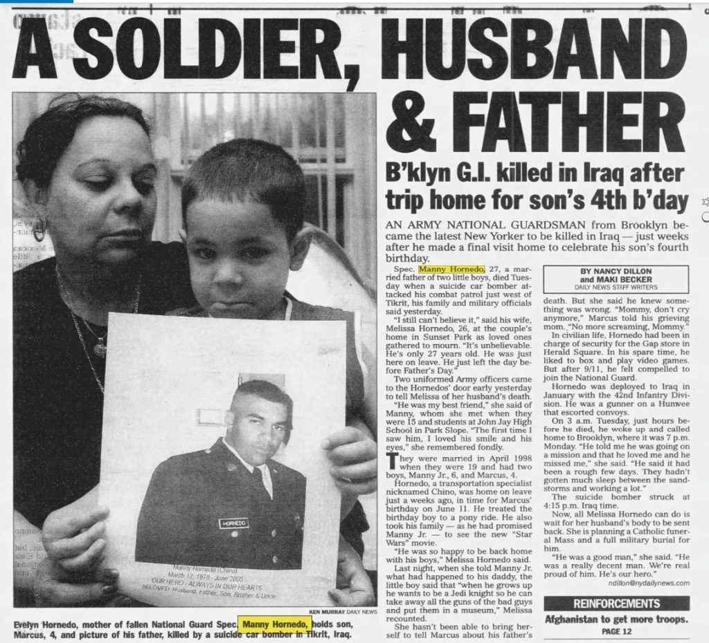 HORNEDO, MANNY (1978-2005). Sergeant, 1569th Transportation Company, New York Army National Guard. Manny Hornedo was born in Brooklyn on March 17, 1978, to Evelyn Crespo (born on December 11, 1956). No records for Manny’s father could be found. His family was of Puerto Rican ancestry per a news report in the July 8, 2005 New York Daily News. Manny’s older half-sister, Carmen Cruz Rodriguez, daughter of Evelyn Crespo and George L. Cruz, was born in 1974.