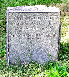 BENNETT, JAMES (1808–1867). Unknown soldier history. According to his government-issued gravestone, circa 1900, he was a “war veteran of 1861-1865.” He last resided at 22 Summit Street, in Brooklyn. Section 126, lot 2454, grave 408.