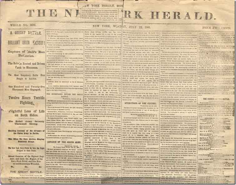 Of Lincoln’s first nomination, Bennett reported, “Abram [sic] Lincoln is an uneducated man — a vulgar village politician, without any experience worth mentioning in the practical duties of statesmanship, and only noted for some very unpopular votes which he gave while a member of Congress. In politics he is as rabid an abolitionist as John Brown himself, but without the old man’s courage.” Lincoln and others made overtures to Bennett to change his position, especially through the Herald’s reporter, Henry Villard. However, Bennett’s support of the Union was greater than his defense of slavery, and once guns were fired at Fort Sumter, his position changed. Bennett wanted the President to know of his support of the Union, offered his yacht, the Rebecca, to the Treasury Department, and even wanted his son, James Gordon Bennett Jr., commissioned a lieutenant in the Revenue Service; the commission was granted and the young man served until May 11, 1862. The newspaper was well-known for its expansive coverage of the Civil War, had forty reporters in the field, and published maps of the battles. After first Bull Run, Virginia, he wrote in an editorial: