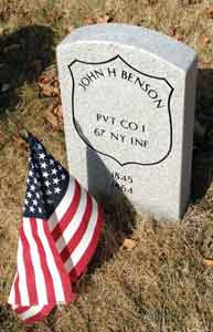 BENSON, JOHN H. (1845-1864). Private, 67th New York Infantry, Company I. A native New Yorker, he enlisted at Brooklyn on May 1, 1861, mustered into the 67th New York the next month on June 20, and was discharged for disability on November 22, 1863, at Yorktown, Virginia. He died of chronic diarrhea on May 1, 1864, at his residence in New York City. Section 115, lot 13536 (Soldiers’ Lot), grave 84.