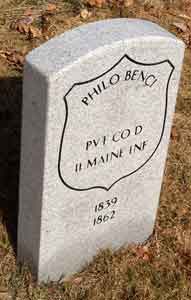 BENCI (or BEARCE), PHILO (1839-1862). Private, 11th Maine Infantry, Company D. A resident of Springfield, Maine, he enlisted on October 19, 1861, immediately mustered into the 11th Maine Infantry, and died from typhoid fever at College Hospital in Brooklyn on July 14, 1862. His remains were moved to its current location on November 6, 1863. In 1869 his mother applied for a pension; it was granted under certificate 138,480. His father applied for a pension in 1883; that was granted under certificate 206,666. Section 115, lot 13536 (Soldiers’ Lot), grave 77.