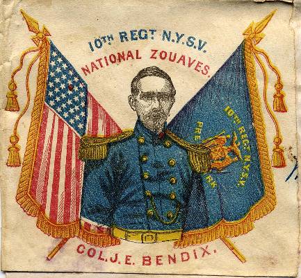 BENDIX, JOHN E. (1818-1877). Brigadier general by brevet; colonel, 7th New York Infantry; 10th New York Infantry. Born on the Sarah, a steamer that plied the St. Lawrence River between Canada and the United States, his parents returned to their native Germany where Bendix was educated. (Another document says Bendix was born in England.) He immigrated to the United States as a teenager, settled in New York and learned the trades of pattern-maker and machinist. He joined the 9th New York State Militia in 1847 and subsequently became a lieutenant colonel of the 11th New York State Militia in 1859.