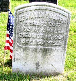 BAKER, BENJAMIN F. (1842-1901). Private, 102nd New York Infantry Company C. A native of Long Island, New York, Baker enlisted as a private and mustered into his company on December 4, 1861, at Camp Hillhouse, New York. On July 18, 1864, he was listed as absent for sickness. He was absent when his company mustered out on July 21, 1865, at Alexandria, Virginia.