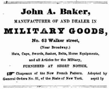 BAKER, JOHN ABBOTT (1812-1862). First lieutenant and ordnance officer, 7th Regiment, New York State Militia. A native of New York, Baker settled in New York City in 1838 where he was harness and saddle maker until 1851. He then founded an enterprise that manufactured and imported military goods and equipment. That business, which advertised that items could be furnished on short notice such as caps, swords, sashes, horse equipment, was located at 53 Walker Street in New York City as of 1859.