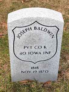 BALDWIN, JOSEPH (1818-1870). Private, 40th Iowa Infantry, Company K. Buried in Green-Wood’s Soldiers’ Lot, this may be the Joseph Baldwin who was born in Ireland and lived in Vinton, Iowa, at the time of his enrollment. He enlisted at age 44 as a private on August 16, 1862, mustered into the 40th Iowa on November 3 of that year, and was discharged for disability at Snyder’s Bluff, Mississippi, on July 21, 1863. He last resided on Harrison Street in Brooklyn. Section 115, lot 13536 (Soldiers’ Lot), grave 115.