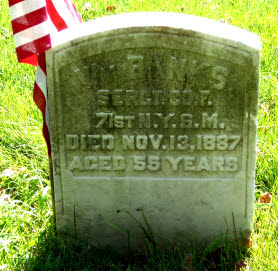 BANKS, WILLIAM O. (1831-1887). Sergeant, 71st Regiment, New York State National Guard, Company F. He enlisted and mustered in on May 27, 1862, and mustered out on September 2 after serving for three months. He was a member of the G.A.R., George C. Strong Post #534, and last resided at 254 Sackett Street in Brooklyn. Banks died from fatty degeneration of the heart. Section 200, lot 26111.