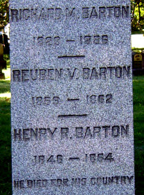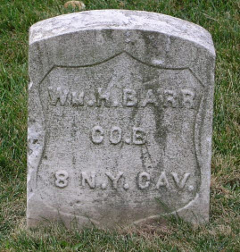 BARBER, CHARLES H. (1828-1866). Captain, 176th New York Infantry, Company K. A New Yorker by birth, he enlisted as a captain at New York City on January 10, 1863, was immediately commissioned into the 176th New York, and mustered out on December 16 of that year. He last lived at 10 Grove Street in Manhattan. His death was attributed to heart disease. Section B, lot 9895, grave 839.