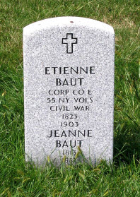 BAPTISTE (or BAPTIS, BAPTIST), JOHN H. (1847-1914). Private, 52nd Regiment, New York State National Guard; 176th New York Infantry, Company I. A native New Yorker, Baptiste enlisted at Brooklyn as a private on October 9, 1862, and mustered into the 52nd National Guard (company not known) seven days later. He transferred into the 176th New York on December 15, 1862, and mustered out at New York City on November 16, 1863. His pension record also indicates service in Company D of the 47th New York but there are no further details. According to his obituary in The New York Times, his two brothers enlisted with him in the same regiment and both were killed in battle.