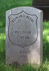 A bookkeeper in 1870, Beecher soon joined the Police Department in New York City, serving as a mounted officer and roundsman during his tenure. The 1873-1876 Brooklyn Directory lists him as a police officer. In one article in the Brooklyn Daily Eagle (July 22, 1877) mentioning him and his police work, it said that he had the nickname, Mamma’s Boy. Apparently he was hot-tempered in his policing and twice got into fracases although it is unclear to what extent he was disciplined for his actions. The 1880 and 1890 censuses and the 1890-1892 Brooklyn Directory indicate that he was a police officer at that time; the aforementioned directory indicates that he lived at 354 11th Street. In 1892, he applied for an invalid pension, application 1,129,404, but there is no certificate number. His last residence was 339 11th Street, Brooklyn. Beecher died from tuberculosis. Although his widow, Jessie Beecher, applied for a pension in 1894, application 591,900, no certification number is available. Section 202, lot 28560, grave 2.