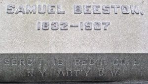 BEESTON, SAMUEL (1832-1907). Sergeant, 16th New York Heavy Artillery, Company E; private, 1st New York Infantry, Company E. Beeston was born in England. After enlisting at New York City as a private on November 27, 1863, he mustered into the 16th New York Heavy Artillery, was promoted to sergeant, and mustered out on August 21, 1865, at Washington, D.C.