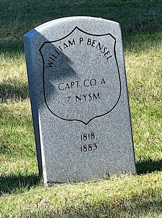 BENSEL, WILLIAM P. (1818-1883). Captain, 7th Regiment, New York State Militia, Company A. At age 42, he began his first tour of duty after enlisting as a captain at New York City on April 17, 1861. Bensel was commissioned into the 7th Regiment on May 16 of that year, and mustered out the next month on June 3. He also served as a captain for 30 days with the same regiment and company (then part of the New York State National Guard) in June-July 1863, mustering out on July 20 of that year. The regiment, under the command of Colonel Marshall Lefferts (see), spent time in Baltimore and Frederick, Maryland.