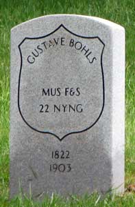 BOHLS, GUSTAVE (or GUSTAV) (1822-1903). Musician, 22nd Regiment, New York State National Guard. Bohls, who was born in Germany, served for 30 days in the 22nd Regiment in 1863. He entered as a band member, was assigned to the Field and Staff, and was promoted to the rank of musician during his service. In civilian life, he was employed as a musician. Bohls last lived in New York where he died from pneumonia. Section 202, lot 28093, grave 1.