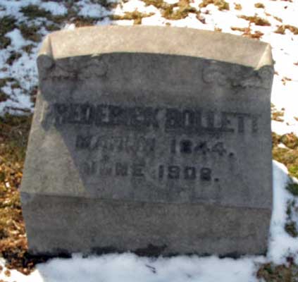 BOLLETT (or BOLLET), FREDERICK H. (1844-1908). Private, 5th New York Infantry, Company H. Bollett enlisted at New York City on April 23, 1861, and mustered into the 5th on May 9. A carriage-maker by trade, he was 6′ 1½” with blue eyes and light brown hair. Bollett was wounded in the left leg at Second Bull Run, Virginia, on August 30, 1862, captured that day, and paroled three days later. After being hospitalized in Alexandria, Virginia, and given sick leave, he returned to duty on April 8, 1863, and mustered out with his company at New York City a month later on May 14.
