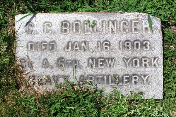 BOLLINGER, CHRISTOPHER (or CHARLES) G. (1841-1903). Sergeant, 5th New York Heavy Artillery, Company L (although his gravestone says Company A). Bollinger, also known as Charles, was born in Holland. He enlisted as a private on March 25, 1864, mustering into the 5th New York Heavy Artillery. He was promoted to sergeant on June 6, 1865, and mustered out on July 19, 1865, at Harpers Ferry, West Virginia.