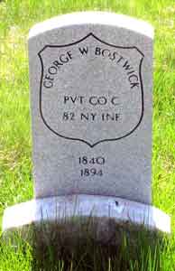 BOSTWICK, GEORGE W. (1840-1894). Private, 82nd New York Infantry, Company C. After enlisting and mustering into the 82nd New York on June 11, 1861, at New York City, he deserted on July 22, 1861, at Washington, D.C. His last residence was on Van Dam Street in Manhattan. Bostwick died from Bright’s disease. Section D, lot 18513, grave 59.