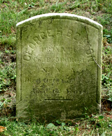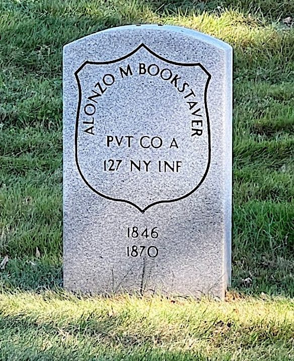 BOOKSTAVER, ALONZO M. (1846-1870). Private, 127th New York Infantry, Company A. After enlisting at New York City on August 12, 1862, he mustered in on September 8. Wounded in the Battle of Diascund Bridge, Virginia, on July 11, 1863, he mustered out on June 6, 1865, at Armory Square Hospital, Washington, D.C. He last lived at 30 Horatio Street in Manhattan. He died from cholera infantum. Section 91, lot 10277.