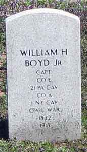 BOYD, JR., WILLIAM H. (1842-1918). Captain, 21st Pennsylvania Cavalry, Company E; second lieutenant, 1st New York Cavalry, Companies C, L, I, and A. Boyd enlisted as a sergeant at Philadelphia, Pennsylvania, on August 19, 1861, and mustered immediately into Company C of the 1st New York Cavalry. He rose to the rank of quartermaster sergeant on December 12, 1861, and to second lieutenant on September 9, 1862, effective upon his transfer to Company L. He was transferred to Company I on November 1, 1862, and to Company A on February 1, 1863.