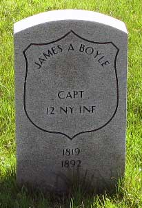 BOYD, ROBERT (1844-1864). Private, 47th New York Infantry, Company K. Of Irish birth, he enlisted at New York City, where he resided, on March 9, 1864, and mustered into the 47th on that date. He died of pyemia on December 19, 1864, at White Hall in Bucks County, Pennsylvania, and was interred two days later. However, his gravestone states that he was killed at the Battle of Chapin’s Farm, Virginia. Section 75, lot 8004.