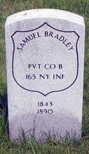 In 1887, Bradley’s application for an invalid pension was approved, certificate 418,477. As per his obituary in the New York Herald, he was a member of the Noah L. Farnham Post #458 of the G.A.R. and the Puritan Temple of the Templars of Liberty, a benevolent association known to be “patriotic” and anti-Catholic; members of both groups were invited to attend his funeral. In addition, the Veteran Association of the 165th New York invited its members to attend the funeral of their comrade. His last residence was 1654 Seventh Avenue in Manhattan. Bradley’s death was attributed to diarrhea. Margaret Bradley applied for and received a widow’s pension in 1890, certificate 340,178. Section 126, lot 2458, grave 1037.