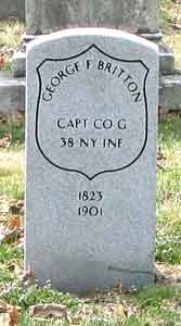 BRITTON, GEORGE F. (1823-1901). Captain, 38th New York Infantry, Company G. Born in Rhode Island, he enlisted at New York City as a captain on May 11, 1861, was commissioned into the 38th New York the next month on June 3, and was discharged on August 2.
