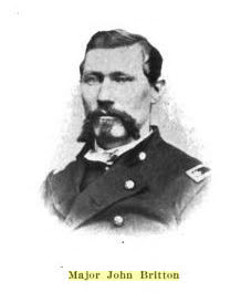 BRITTON, JOHN (1837-1897). Major, 18th Regiment, Pennsylvania Cavalry, Company F. Britton was born in Brownsville, Maryland. After enlisting as a second lieutenant on December 8, 1862, he was immediately commissioned into the 18th Pennsylvania Cavalry, and was promoted to first lieutenant on April 28, 1863. Britton served through 48 battles and received several severe wounds, a saber cut to his head at Hanover, Pennsylvania, on June 30, 1863; a saber cut to the face at Hagerstown, Maryland, on July 6, 1863; and a gunshot wound at Buckland Mills, Virginia, on October 19, 1863. In addition, he had two horses shot under him while in action.