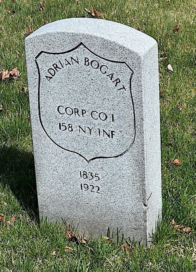 BOGART (or BOGERT, BOGEART), ADRIAN (1835-1922). Corporal, 158th New York Infantry, Company I; private, 84th New York (14th Brooklyn) Infantry, Company A. A New Yorker by birth and a resident of the New Utrecht section of Brooklyn, he enlisted as a private at Brooklyn on April 18, 1861, mustered into the 14th on May 23, and deserted on September 19 of that year at Arlington, Virginia. On September 3, 1862, Bogart re-enlisted at Brooklyn as a wagoner and mustered immediately into Company I of the 158th New York. He was promoted to corporal on May 10, 1865, and mustered out on June 30, 1865, at Richmond, Virginia.