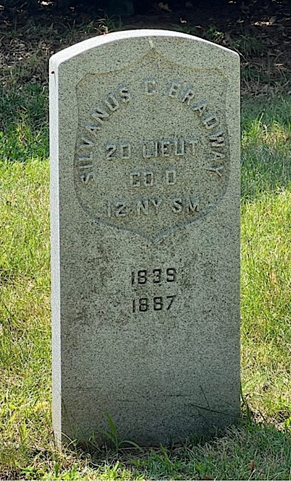 BRADWAY, SILVANUS (or SYLVANUS) C. (1839-1887). Second lieutenant, 12th Regiment, New York State Militia, Company G. Bradway, who was born in New York City, enlisted there as a sergeant on April 19, 1861, mustered into his company on May 2, and mustered out after three months on August 5 at New York City. When the 12th Regiment was reactivated for 30 days in 1863, and part of the New York State National Guard, he was commissioned into the same company as a second lieutenant on July 4, and mustered out on July 20, 1863, at New York City.