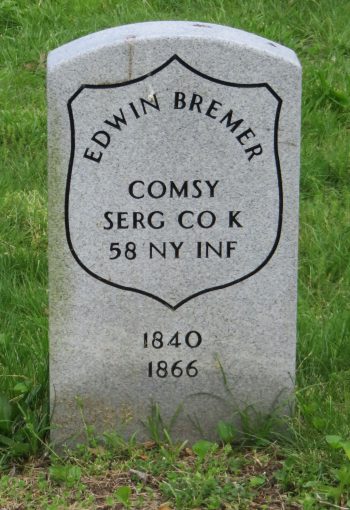 BREMER, EDWIN (1840-1866). Commissary sergeant, 58th New York Infantry, Company K; private, United States Rifles, Company D. Bremer, who was born in New York State, enlisted as a private at New York City on October 7, 1861, and mustered into the U.S. Rifles on that date. On November 23, 1861, he transferred into Company K of the 58th New York (a regiment formed by consolidating the U.S. Rifles) and re-enlisted on January 1, 1864. He was promoted to commissary sergeant on November 13, 1864, and was transferred into the regiment’s Field and Staff. Bremer was discharged for disability on October 14, 1865, at David’s Island, New York Harbor. His last residence was 207 Avenue B in Manhattan. Section 59, lot 2229, grave 7.