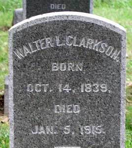 CLARKSON, WALTER LIVINGSTON (or M.) (1839-1915). Private, 82nd New York Infantry, Company I. A native of Saugerties, New York, he enlisted at New York City on March 4, 1862, mustered into the 82nd that day, and was discharged for disability on October 1 at Fort Monroe, Virginia.