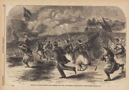Coe was over 6′ tall and a resident of New York City at the onset of the Civil War. He served in the City’s volunteer fire department with Hose 19 and Hose 9 and was employed by the Board of Education at the time of his enlistment on April 19, 1861. He mustered into service when the 71st was activated on May 3, 1861. Coe fought at Bull Run, Virginia, volunteered to patrol the Potomac on the USS Baltimore, and when his colonel was killed at Alexandria, he assisted in dragging him out of the line of fire, then helped sew his body in the flag. When Coe returned to New York City, he was made color-bearer and held the banner during a local parade.