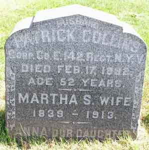 COLLINS, PATRICK (1838-1892). Corporal, 142nd New York Infantry, Company E. Collins enlisted as a private at Oswegatchie, New York, on August 25, 1862, and mustered in on September 29. He was promoted to corporal on September 15, 1863, and mustered out on June 7, 1865, at Raleigh, North Carolina. Collins last lived at 6 4th Place in Brooklyn. His cause of death was pneumonia. In 1892, Martha Collins, who is interred with him, applied for and received a widow’s pension, certificate 355,982. Section 135, lot 27263, grave 958.
