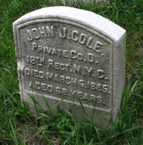 COLE, JOHN J. (1826-1895). Private, 14th New York Cavalry, Companies C and K; 18th New York Cavalry, Company D. Cole enlisted at New York City on November 10, 1862, mustered into the 14th New York Cavalry on December 22, was transferred to Company K on October 16, 1863, and was transferred to the 18th New York Cavalry on June 30, 1865. According to the census of 1880, he was a builder. In 1881, his application for an invalid pension was granted, certificate 308,431. The Veterans Schedule of 1890 confirms his military service and notes that he sustained a saber cut to his hand and arm during an unstated battle. Although his gravestone indicates he was likely born in 1817, his military records indicate that he was born in 1826. He last lived at 331 Bridge Street in Brooklyn. His death was caused by apoplexy. Section 43, lot 6315.