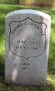 COLGROVE (or COLGRAVE), DANIEL (1826-1875). Sergeant, 173rd New York Infantry, Company I. According to the census of 1850, Colgrove, a native of Charleston, New York, was a grocer; in 1860, he earned a living as a distiller. At the time of his enrollment, he was a merchant who was 5′ 8½” tall with blue eyes, auburn hair and a fair complexion. After enlisting as a corporal at Brooklyn on September 3, 1862, Colgrove mustered into the 173rd on November 10. He rose to the rank of sergeant the next month on December 10, contracted typhoid fever at Brashear City, Louisiana, on April 1, 1863, was detached to the division commissary from October 1864 through March 1865, and mustered out at Savannah, Georgia, on October 18, 1865.