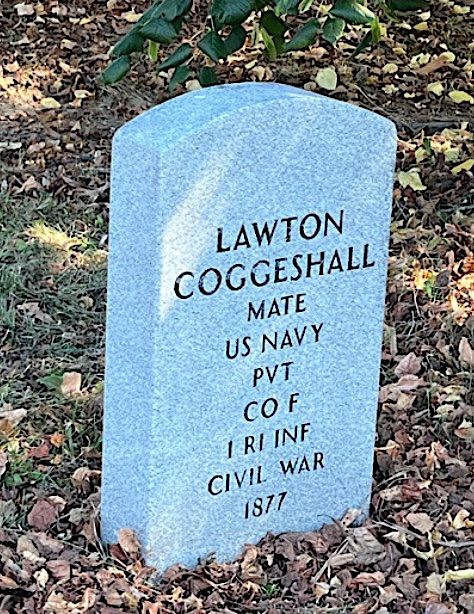 COGGESHALL, LAWTON (1835-1877). Private, 1st Rhode Island Infantry, Company F. Coggeshall was born in Newport, Rhode Island. During the Civil War, he enlisted there as a private on April 17, 1861, and mustered into Company F of the 1st Rhode Island Infantry. He mustered out on August 1, 1861. The Rhode Island State census of 1865 shows that he was a clerk. As per the census of 1870, he was a ship chandler living in Newport, married and having personal property worth $600. The 1879 Newport Directory indicates that he was a ship chandler. The New York Evening Post reported his death in Monticello, Georgia. He may have been the brother of Edwin Coggeshall (see). Section 90, lot 3864.