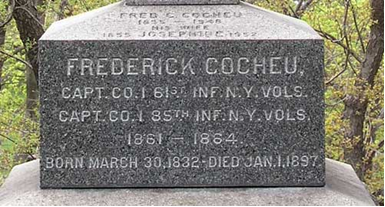 COCHEU, FREDERICK (1832-1897). Captain, 53rd New York Infantry, Company H; 85th New York Infantry, Company H; 61st New York Infantry, Company I. Cocheu, a native of New York City, was self-educated and self-supporting from the age of eight according to his biography in a New York G.A.R. sketchbook. That sketch notes that he enlisted as a private, together with three of his brothers, in April 1861. He then re-enlisted at New York City as a captain on September 24, 1861, and was commissioned into Company H of the 53rd New York, known familiarly as the D’Epineuil Zouaves, on October 17. The regiment was sent to Cape Hatteras, North Carolina, where he was shipwrecked for 48 days on board the John Trucks with 800 men with provisions for only 12 days. After surviving that marooning, he mustered out on March 26, 1862, at Washington, D.C., when his regiment disbanded by order of the War Department.