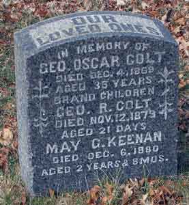A coroner’s inquiry concluded that there had been no foul play and indicated heart disease as the cause of death. His wife indicated that he fell off a fire wagon months before (while on duty with insurance patrol no. 3) but that was discounted as a cause of death. Colt belonged to the Old Fire Department of New York, serving on Engine No. 8. In 1890, Frances Colt applied for and received a widow’s pension, certificate 324,565. Section 127, lot 17931, grave 203.
