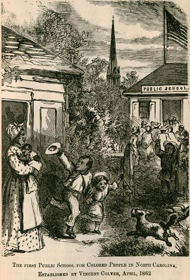 “…These schools are now to be closed, not by an officer of the army, under whose sanction they have been commenced, but by the necessity laid upon me by Governor Stanley, who has informed me that it is a criminal offense under the laws of North Carolina, to teach the blacks to read, which laws he has come from Washington to enforce.” (p.44) “….The old people dropped their heads upon their breasts and wept in silence; the young looked at each other with mute surprise and grief at this sudden termination of their bright hopes. It was a sad and impressive spectacle. Mr. Colyer himself could hardly conceal his emotion. A few moments of silence followed, when, as if by one impulse, the whole audience rose and sang with mournful cadence, ‘Praise God from whom all blessings flow,’ and then shook hands and departed.” (p.47)