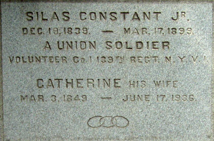 CONSTANT, JR., SILAS P. (1839-1899). Private, 139th New York Infantry, Company I. A New Yorker by birth, he was educated at P.S. 3 on Bedford Avenue in Brooklyn. As per the 1860 census, he was a carpenter living in Baltimore, Maryland. According to his obituary, he was in Baltimore on April 19, 1861, at the time of the attack there by an angry secessionist mob on the 6th Massachusetts, and he took the side of the Union regiment. After he enlisted at Brooklyn on August 29, 1862, he mustered into the 139th on September 9, 1862. The muster roll shows that he was detached as an orderly to brigade headquarters on July 11, 1864, and returned to his unit that October. According to his obituary, he fought in 17 skirmishes and five battles and was among the first infantrymen to enter Richmond, Virginia. On June 19, 1865, he mustered out at Richmond, Virginia.