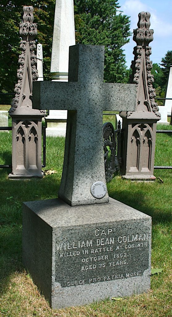 Colman was mortally wounded on October 4, 1862, at the Battle of Corinth, Mississippi. On October 13, 1862, Brigadier General David Stanley once again cited him, “In my military family I suffered an irreparable loss in the death of Capt[ain] W[illiam] D. Colman, assistant adjutant-general, a soldier by nature, a man of rare habits of industry and application, having one thought highly prized beyond all else, viz, duty. He had gone through all the battles from Vera Cruz to the city of Mexico to fall at last by the hands of his false countrymen…” Interment at Green-Wood was on October 5, 1863. Section 78, lot 14013.