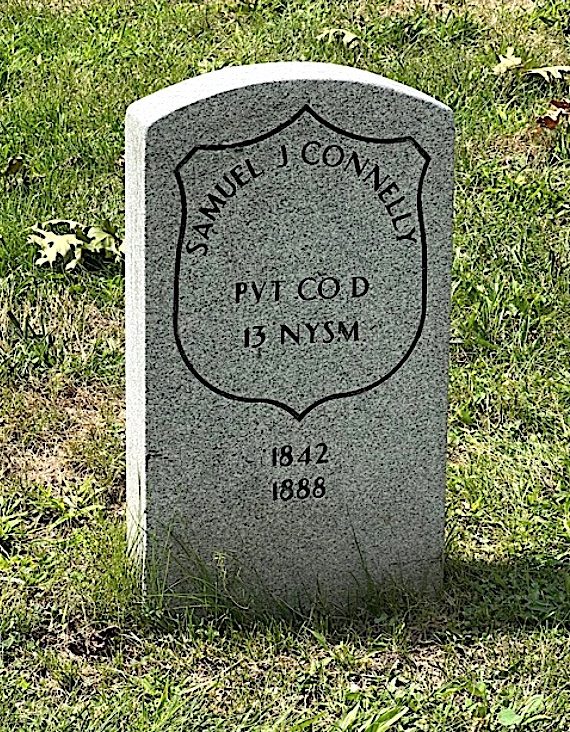 CONNELLY, SAMUEL J. (1842-1888). Private, 13th Regiment, New York State National Guard, Company D. A New Yorker by birth and a clerk according to the 1860 census, Connelly was elected to the Fire Department in 1861. He enlisted at Brooklyn on May 28, 1862, mustered immediately into the 13th Regiment, and mustered out after three months on September 12 at Brooklyn. The census of 1870 indicates that he was employed as a cotton agent. A notice in the Brooklyn Daily Eagle of December 12, 1873, states that he was appointed temporary clerk to Registrar Watt at a salary of $100 a month. As per the 1880 census, he was working as a clerk. His last residence was 291 Court Street in Brooklyn. He died from tuberculosis. Section 63, lot 24306.
