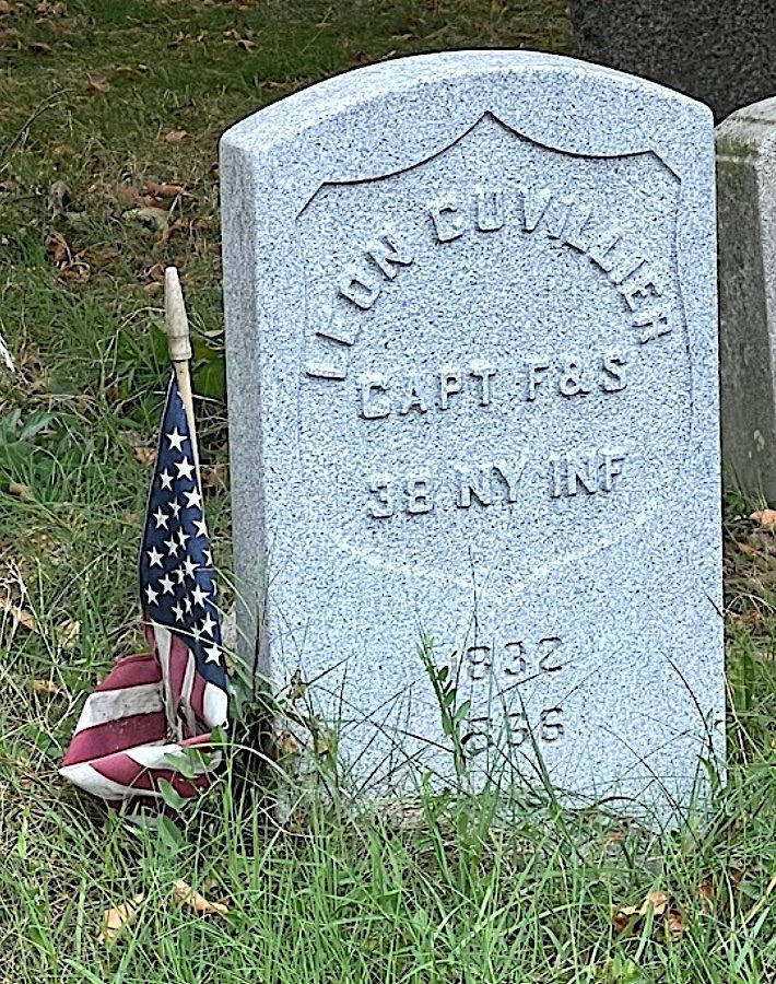 CUVILLIER, LEON (or LOUIS, L.L.) (1832-1866). Captain, 38th New York Infantry, Company I; first lieutenant and adjutant, 55th New York Infantry; private, 7th Regiment, New York State Militia, Company F. Originally from France, Cuvillier first served in the 7th Regiment for 30 days in 1861. He then re-enlisted at Staten Island as an adjutant on August 26, 1861, and was commissioned two days later into the Field and Staff of the 55th New York with a promotion to first lieutenant and adjutant. On May 31, 1862, he was wounded at Fair Oaks, Virginia. An article in the New York Herald on June 8, 1862, notes that soldiers were brought to Boston on the Daniel Webster, a hospital ship of the Sanitary Commission, and would return to their regiments after treatment. Cuvillier was among those treated; he was wounded twice in the left arm and once in the side, and was in “comfortable” condition. On December 23, 1862, he transferred into the Field and Staff of the 38th New York as an adjutant, upon consolidation of units. His promotion to captain on February 19, 1863, became effective upon his transfer to Company I on April 3. He mustered out on June 22, 1863, at East New York. He last resided at 258 South 6th Street in Jersey City, New Jersey. His death was attributed to consumption. In 1880, his wife’s application for a widow’s pension was granted, certificate 237,801. A minor’s pension was also granted at that time, certificate 238,725. Section 115, lot 4196, grave 63.