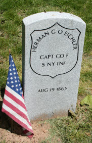 EICHLER, HERMAN G. O. (1831-1863). Captain, 5th New York Infantry, Companies E, H, I, and F. A German native, Eichler was an attorney as per the 1857 New York City Directory. He resided at 21 Christie Street in Manhattan at the start of the Civil War. He enlisted as a third sergeant at New York City on April 25, 1861, and mustered into Company E of the 5th New York on May 9. On September 13, 1861, he was promoted to second lieutenant and rose to first lieutenant on September 24, effective upon his transfer to Company H. He transferred into Company I on July 26, 1862. After becoming sick in August of 1862, he asked for a sick leave because he didn’t want to be discharged from “the regiment to which I am attached and devoted.” On September 24, 1862, he became captain of Company F but was not commissioned, and resigned the next month on October 4. He died of consumption on August 19, 1863. Section 115, lot 13536 (Soldiers’ Lot), grave 22.