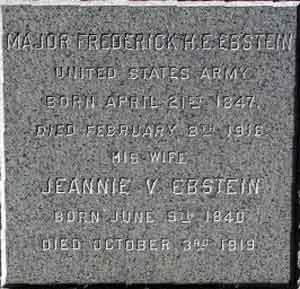 A veteran of the Santiago Campaign of the Spanish-American War, Ebstein became major by brevet of the 19th Infantry on January 16, 1899, and retired from the military on July 8, 1899. He was a professor of military science at the St. Francis Xavier School in New York City after his retirement and also at the De La Salle Institute. In 1902, he was appointed Deputy Police Commissioner of Brooklyn on the recommendation of Theodore Roosevelt, who had befriended Ebstein in Cuba during the Spanish-American War. Subsequently, he was an auditor in the Department of Finance and then became the receiver of taxes in Manhattan in 1910. His last residence was at 1302 Pacific Street in Brooklyn. Ebstein died of pulmonary edema. Jeannie Ebstein, his widow, applied for and was granted a pension in 1916, certificate 812,110. Section 79, lot 7858.