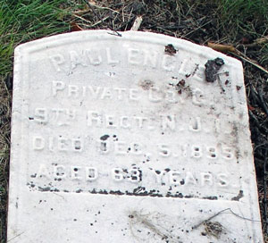 FENDT, ALEXANDER (1845-1865). Private, 1st New Jersey Light Artillery, Company C. Of German origin, Fendt enlisted as a private and mustered into “Batty C” of the 1st New Jersey Light Artillery on September 28, 1864. After suffering from a gunshot wound that caused a contusion of his left lung, he died on April 17, 1865, at City Point, Virginia. Section 102, lot 8761.
