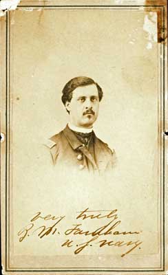 FARNHAM, BELA M. (1843-1899). Assistant quartermaster, 8th Regiment, New York State Militia; acting assistant paymaster, United States Navy. A native of New York City, Farnham first served as a quartermaster in the 8th Regiment, also known as the Washington Grays, when they were called for service in May 1862. As per an article in The New York Times on May 30, 1862, which listed Bela Farnum as the assistant quartermaster, the 8th Regiment was presented with a stand of colors before they departed for Washington, D.C., the previous day. The article reported that the 8th formed their line of march at 4 p.m. on Lafayette Place and then marched to Tiffany’s where there was a ceremony and collation. These words were included in the presentation of the nation’s colors, “…Forget not the example of the patriots of the Revolution, when in the midst of the battle your eyes rest upon the gorgeous ensigns of the State, and of the Republic, which I now, in behalf of some of our most distinguished citizens present to you. Guard them as the emblems of your country, preserve them as the symbols of your own honor, bear them gloriously upon the held, wreathe them with victory, and when you bring them back with you, your fellow-citizens will preserve them as the sacred tokens of your patriotism, and will emblazon upon their silken folds, in letters of gold, the word ‘Washington,’ which shall signify that you have emulated the virtues of the hero and patriot of the Revolution, and have saved from the hands of a ruthless enemy the Capital of the Republic….” There are no further details about that enlistment. Subsequently, he enlisted at New York City as an acting assistant paymaster and joined the United States Navy on September 23, 1864. He was discharged from his duties on June 7, 1865.